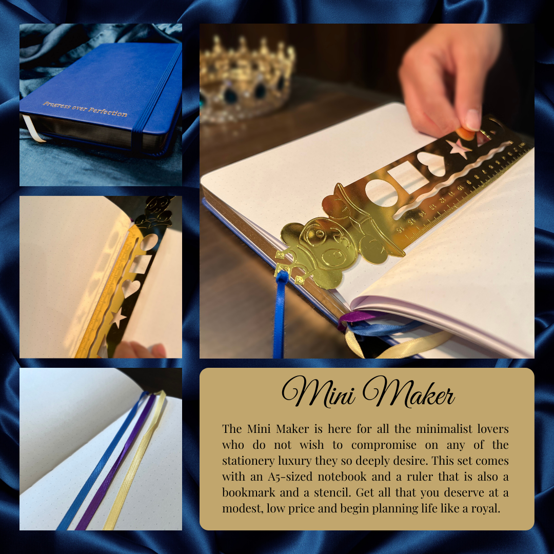 The Mini Maker is the key to accelerating your productivity in the most efficient manner. Stick to the bare essentials and get started without a moment to spare. This set includes a luxurious notebook paired with our durable and adorable 6 inch ruler. Skip the washi tapes and colors or bring your own. Either way, this kit offers you the flexibility to choose your own path in designing your organized life.