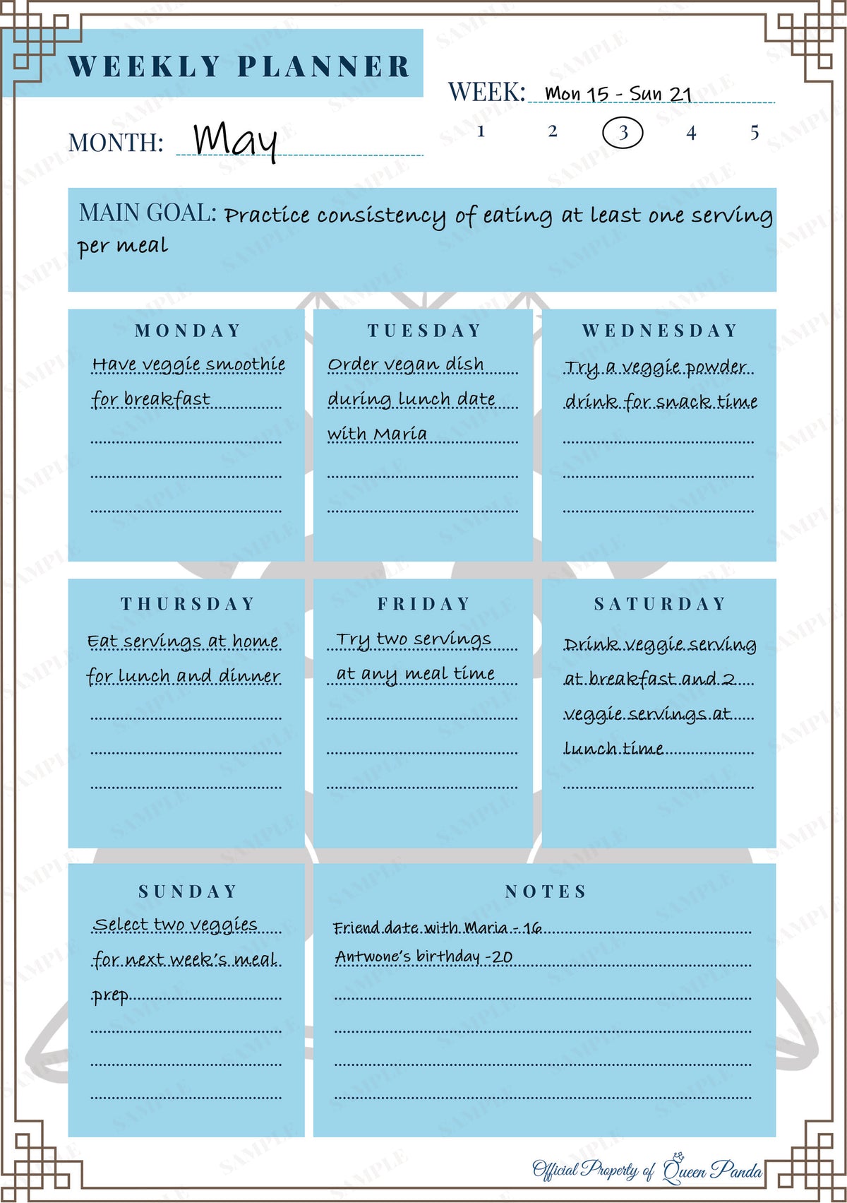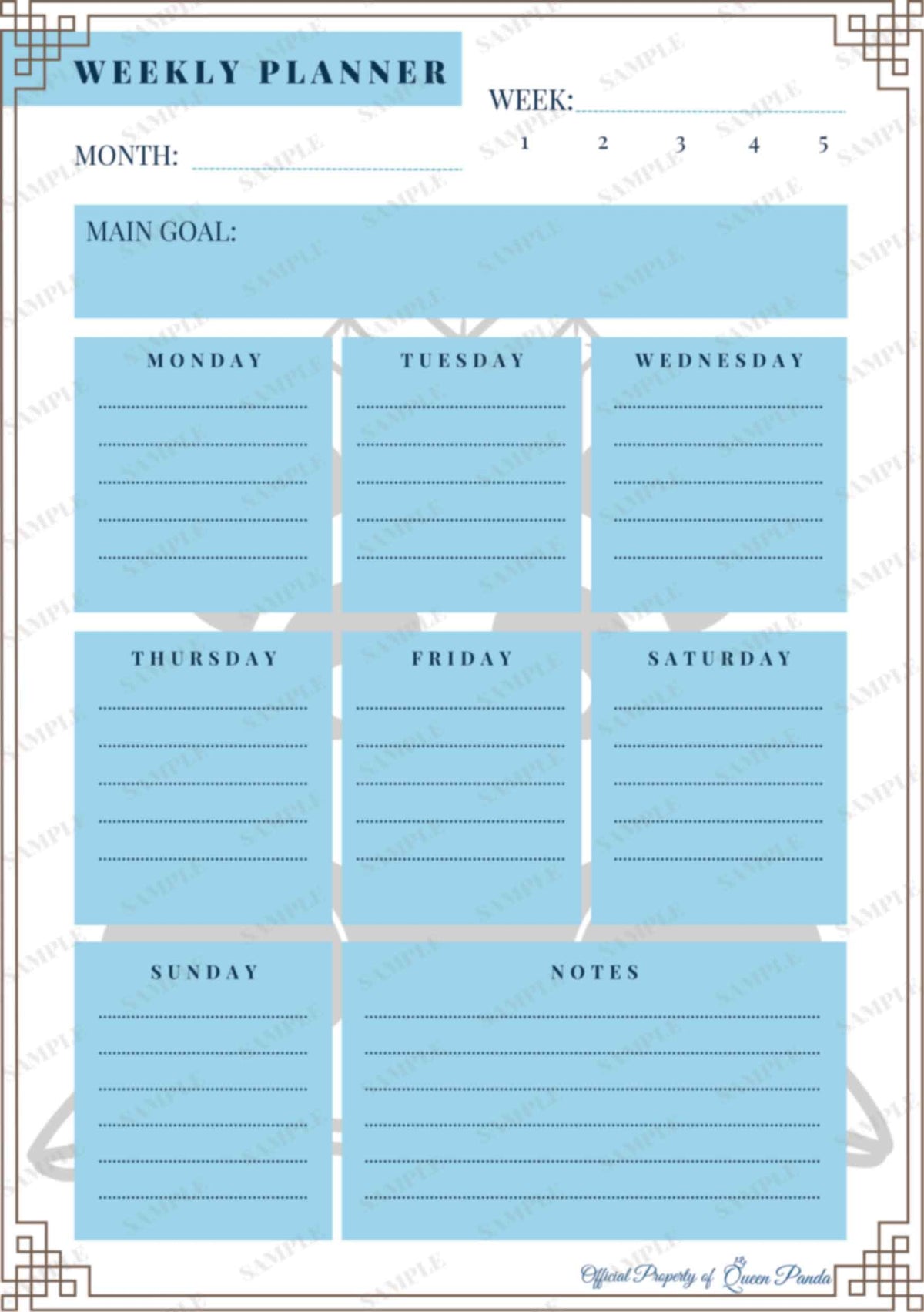 Designed on an A5 sized paper, this 51 paged digital planner includes 5 full weeks of daily and weekly breakdowns for your goals. This is a must-have for anyone looking to streamline their planning process. The planner is perfect for anyone who wants to break down their monthly goals into smaller, more manageable daily tasks.